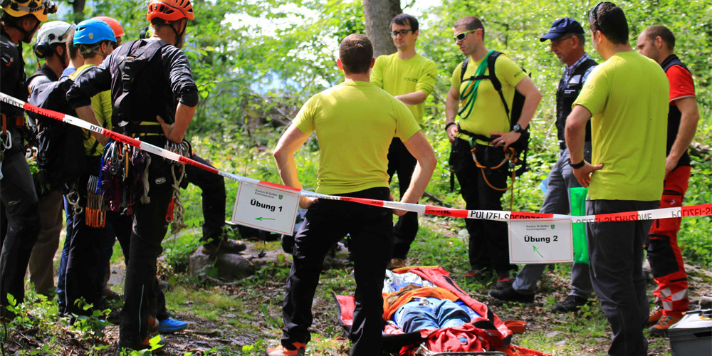 Nach einem theoretischen Halbtag wurde das Zusammenspiel von Rega, Alpiner Rettung Ostschweiz, Staatsanwaltschaft, Kompetenzzentrum Forensik, Dienstchef der Polizei, Alpinkader und Kantonaler Notrufzentrale beim «Tiergarten»in Plons praktisch geübt.
