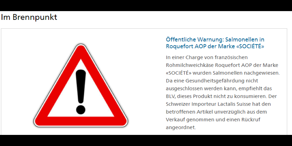 Anders sieht es mit dem Roquefort Käse aus. Der ist zwar auch nicht Jedermanns Sache, aber für Liebhaber des Besonderen ist er ein unverzichtbarer Teil eines schönen Käsebuffets. Die meist verbreitete Roquefort-Marke mit AOP Siegel heisst ««Société». Ausgerechnet in einer Produktelinie dieser Delikatesse haben nun Schweizer Lebensmittel-Laboranten Salmonellen nachgewiesen.