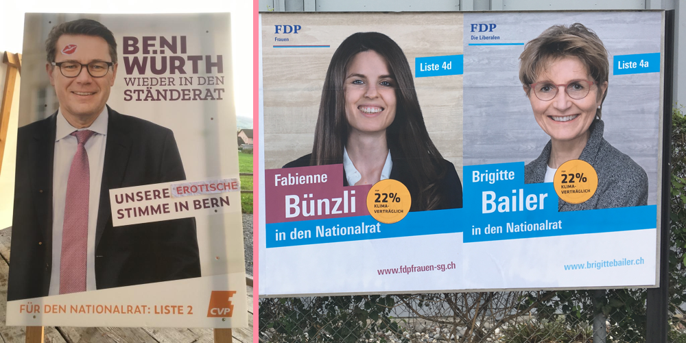 Nur eine kurze Fortsetzung hatte eine andere Plakataktion am Wochenende. Auf mehreren Werbetafeln für den St.Galler Ständeratskandidaten Beni Würth tauchten am Samstag rote Küsse auf und der Spruch: «Die erotische Stimme in Bern».