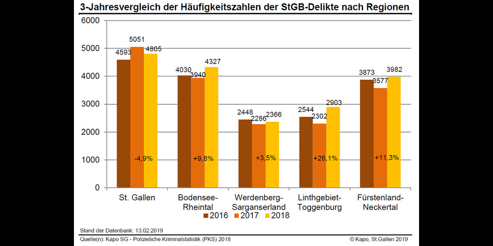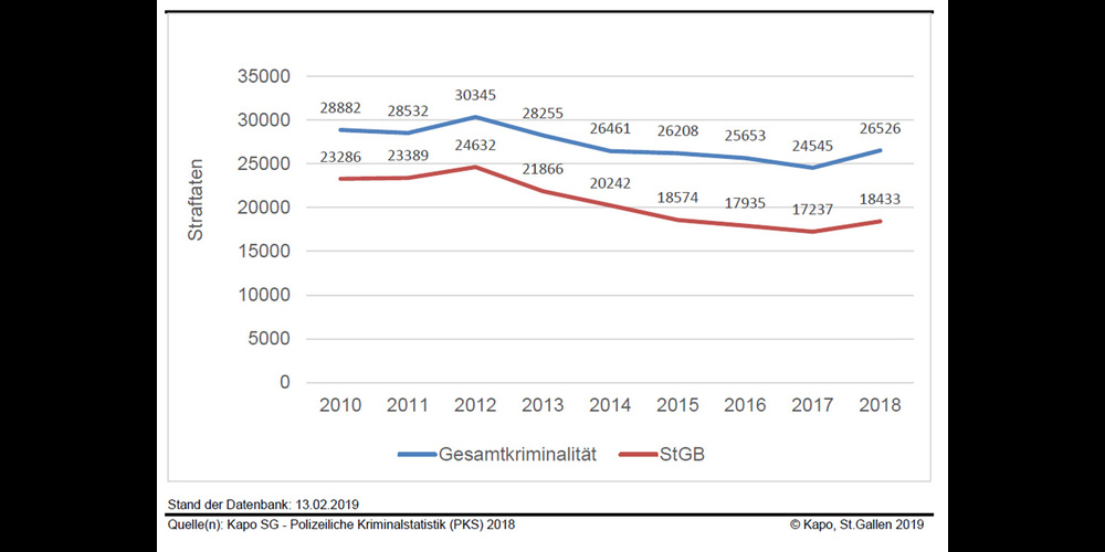 Die Gesamtkriminalität lag im Jahr 2018 im Kanton St.Gallen mit total 26’526 erfass-ten Straftaten mehr als 8% über jener von 2017. Damit hat nach mehreren Jahren der Abnahme 2018 die Zahl der Straftaten wieder zugenommen. Allerdings haben im letzten Jahr die schweren Gewaltdelikte (Tötungsdelikte, schwere Körperverletzungen, schwerer Raub und Vergewaltigungen) um 22% abgenommen (von 88 auf 69 Straftaten). Bei den Delikten nach Schweizerischem Strafgesetzbuch (StGB-Delikte) stellen wir eine Zunahme von 7% auf 18‘433 fest. Dies sind 1'196 Delikte mehr als im Vorjahr. Insgesamt mussten mehr Delikte gegen Leib und Leben bearbeitet werden, eine Steigerung von 874 auf 916 oder um 5% (insbesondere Steigerung bei Schlägereien, Raubüberfällen und sexueller Nötigung). Die vollendeten und versuchten Tötungsdelikte haben von 18 im Vorjahr auf 12 im Jahr 2018 abgenommen (-33%); auch die schweren Körperverletzungen sind gesunken, von 25 auf 20 (-20%).