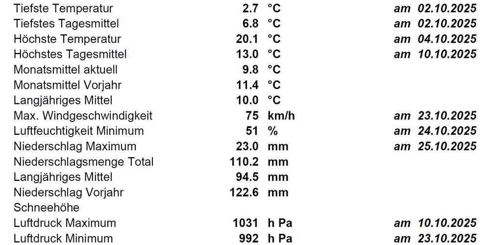 Es ist schon lange her, dass wir einen so typischen Herbst erleben durften. Mit oben blau und unten grau startete dieser Oktober, allerdings war im Flachland nur wenig von diesem «goldigen Wetter» zu sehen, der Hochnebel war hartnäckig. Nach einer 14-tägigen Trockenperiode wurde es stürmisch und nass, ja, gar die Schneefallgrenze fiel unter 1'000 Meter hinunter. Es bleibt ja noch die Hoffnung auf goldige und milde Herbsttage.