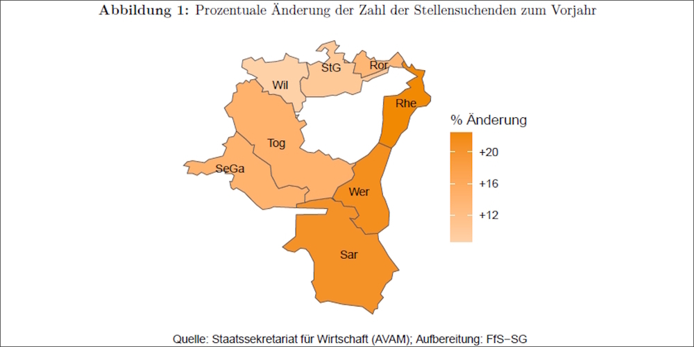 In allen Wahlkreisen ist die Zahl der Stellensuchenden im Vorjahresvergleich gestiegen, zwischen 8,6 Prozent im Wahlkreis Wil und 22,4 Prozent im Rheintal. Unterdurchschnittlich ist auch die Zunahme im Wahlkreis St.Gallen (+10,1%). Über dem kantonalen Mittel von +14,5 Prozent liegt sie im Werdenberg (+21,2%) und im Sarganserland (+20,6%). Die anderen Wahlkreise bewegen sich im kantonalen Mittel.