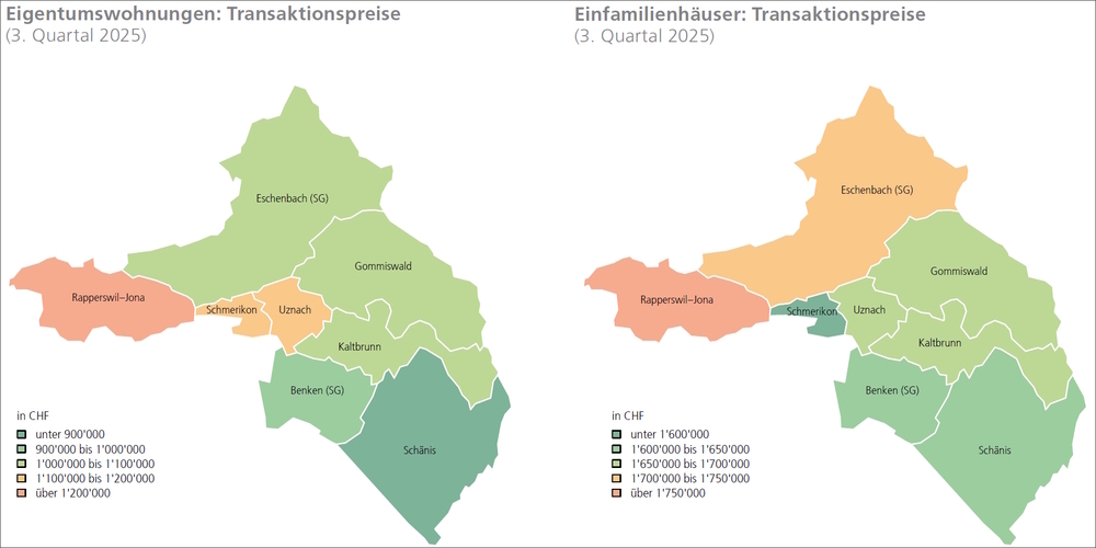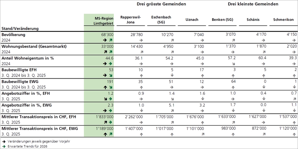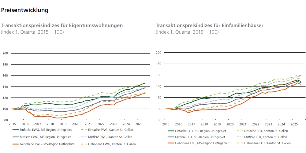 Trotz zeitweise reger Neubautätigkeit bleibt das Angebot auf den Eigenheimmärkten im Linthgebiet ausgesprochen knapp. Die Zahl der ausgeschriebenen Eigentumswohnungen verharrt auf einem äusserst tiefen Niveau: Im 3. Quartal 2025 standen gemessen am Bestand lediglich 2.3 Prozent zum Verkauf. Auch bei den Einfamilienhäusern hat sich die Auswahl weiter verengt, die Angebotsziffer liegt hier bei nur 1.2 Prozent. Beide Werte zählen zu den niedrigsten im gesamten Kanton St.Gallen und liegen deutlich unter den landesweiten Durchschnittswerten von 4.1 respektive 2.7 Prozent.