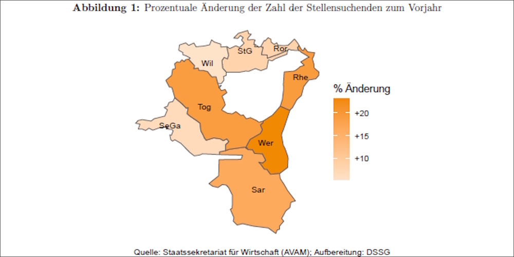 Im Jahresmittel 2025 waren 10'828 Personen bei einem RAV zur Stellensuche gemeldet. 2024 waren es über 1'300 weniger. Dies entspricht einem Anstieg um 13,9 Prozent. Dieser Wert liegt unter dem landesweiten Anstieg, der 2025 durchschnittlich 16,0 Prozent betrug. Hierbei könnte der starke Industrieanteil im Kanton St.Gallen eine Rolle spielen.