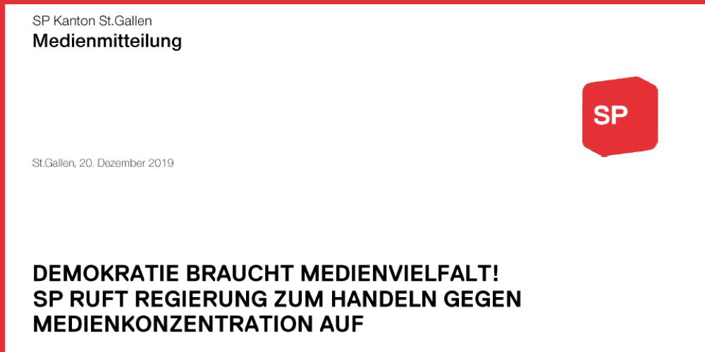 Angesichts der Medienkonzentration und der sinkenden Medienvielfalt verlangt eine Motion der SP-Kantonsräte Peter Hartmann und Max Lemmenmeier die Schaffung gesetzlicher Grundlagen für eine direkte Medienförderung im Kanton St.Gallen. Nun liegt die Antwort der Regierung vor. Auch die Regierung sorgt sich um die Medienvielfalt. Sie ist aber aus ordnungspolitischen Gründen nicht bereit zu handeln. Für die Motionäre ist diese Haltung absolut unverständlich, denn die Situation der Medien ist dramatisch und verlangt ein rasches Handeln.