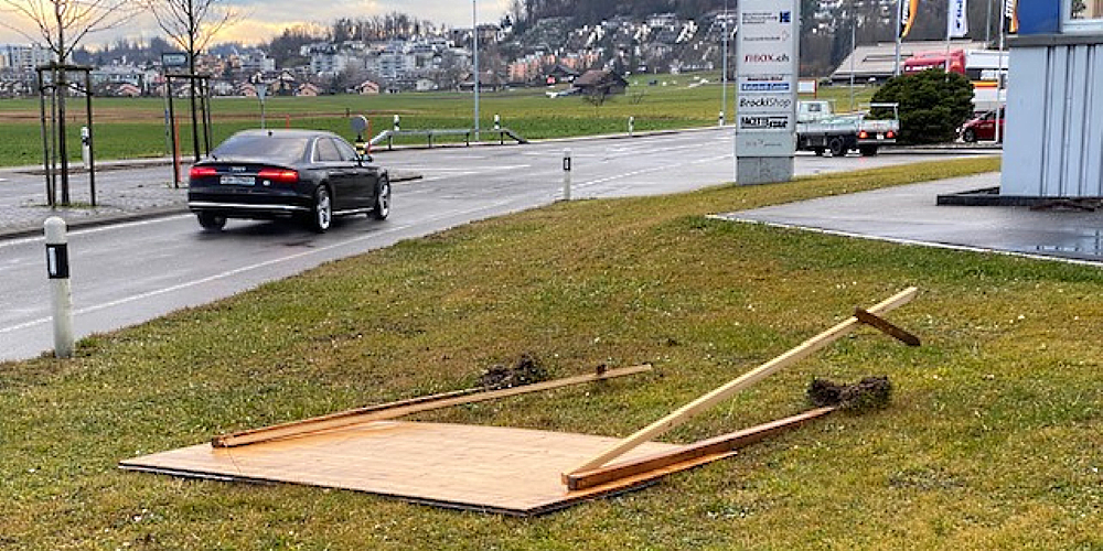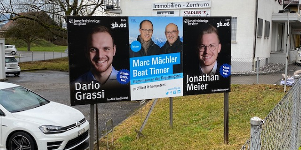 Was ein richtiger Politiker ist, der lässt sich nicht erschüttern. Er legt Hand an oder hat zumindest Helfer, die dies tun. So ist es offensichtlich bei den Jungfreisinnigen Dario Grassi und Jonathan Meier, die nun wieder wie eine 1 in der Gegend stehen und für die eigenen grossen Brüder - sprich Regierungsräte - zusätzlich Wahlkampf betreiben.