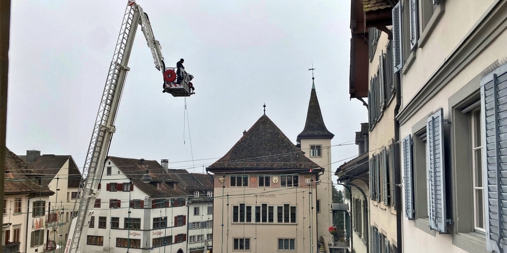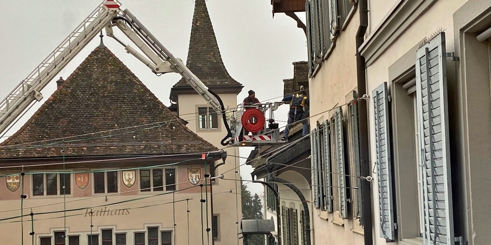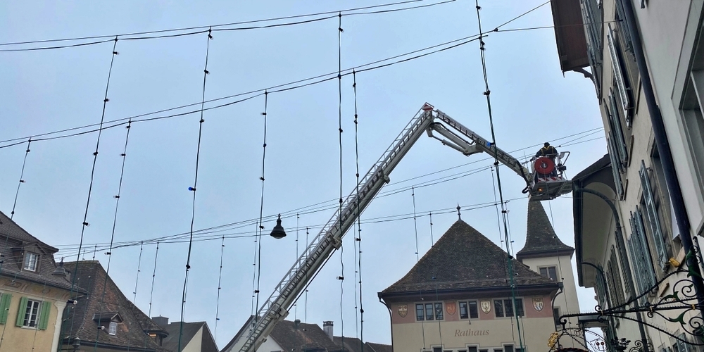 Es wurde gute Arbeit geleistet beim Hauptplatz: Fleissig hängten Arbeiter der Feuerwehr Rapperswil-Jona vom Feuerwehrkran aus viele Lichterketten auf, welche wie jedes Jahr die Rosenstadt Abends zum Leuchten bringen.