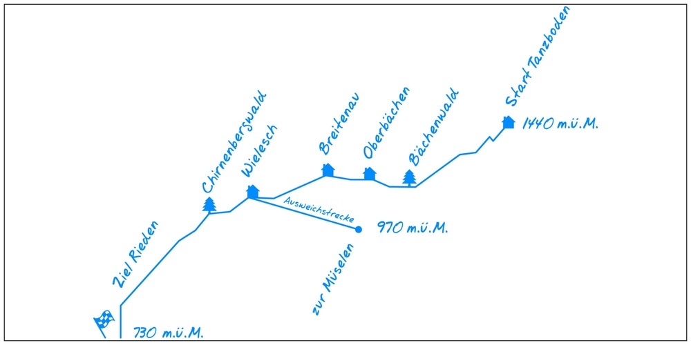 Der Start erfolgt um 12:00 Uhr auf der Alp Tanzboden, dort besteht eine Verpflegungsmöglichkeit. Die einzigartige Strecke führt über verschiedene Alpen bis ins Dorf Rieden. Sollte im Zielbereich nicht ausreichend Schnee vorhanden sein, wird das Rennen über eine Ersatzstrecke mit Ziel Müselen geführt.